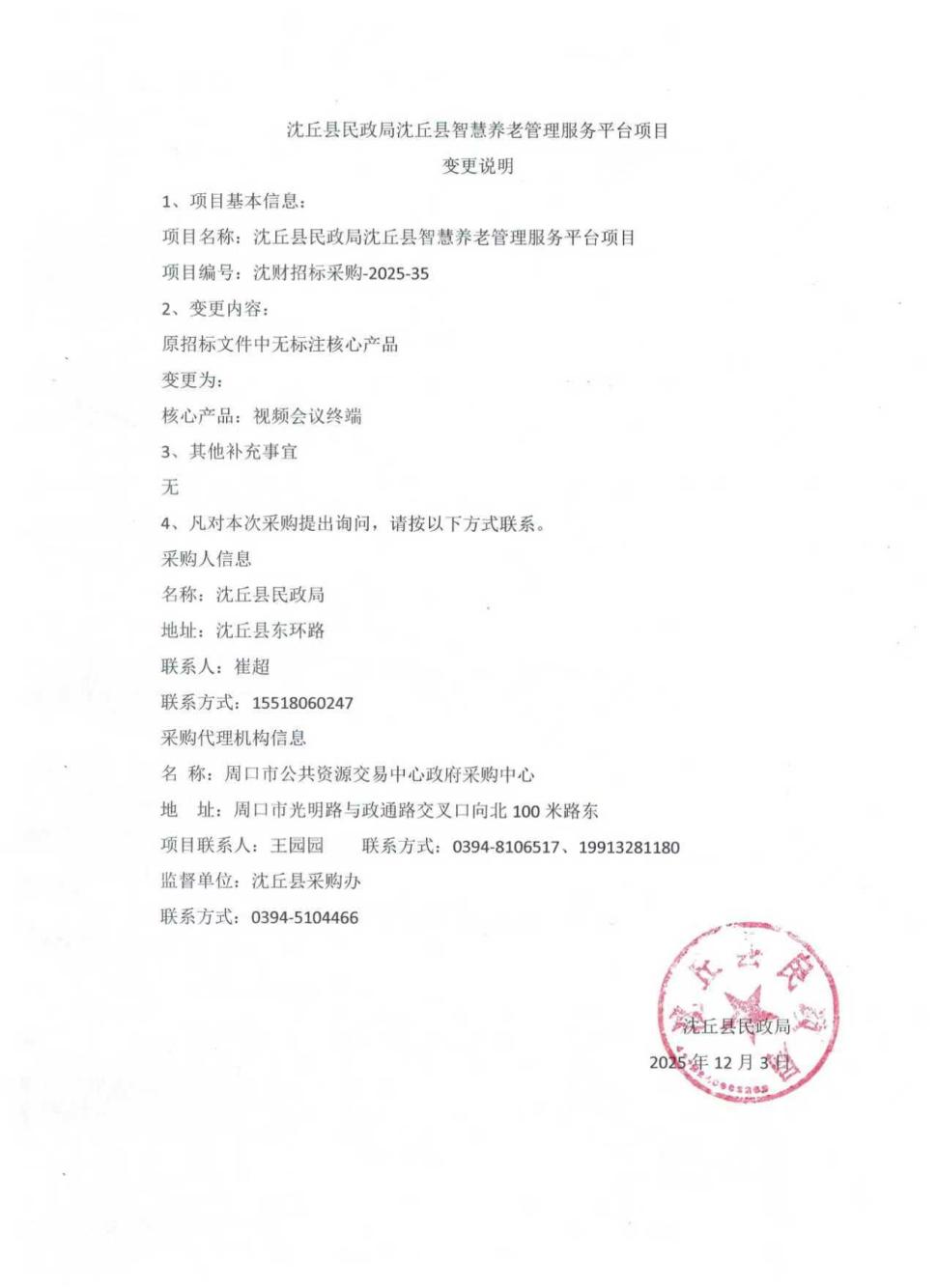 沈丘县民政局沈丘县智慧养老管理服务平台项目-更正公告